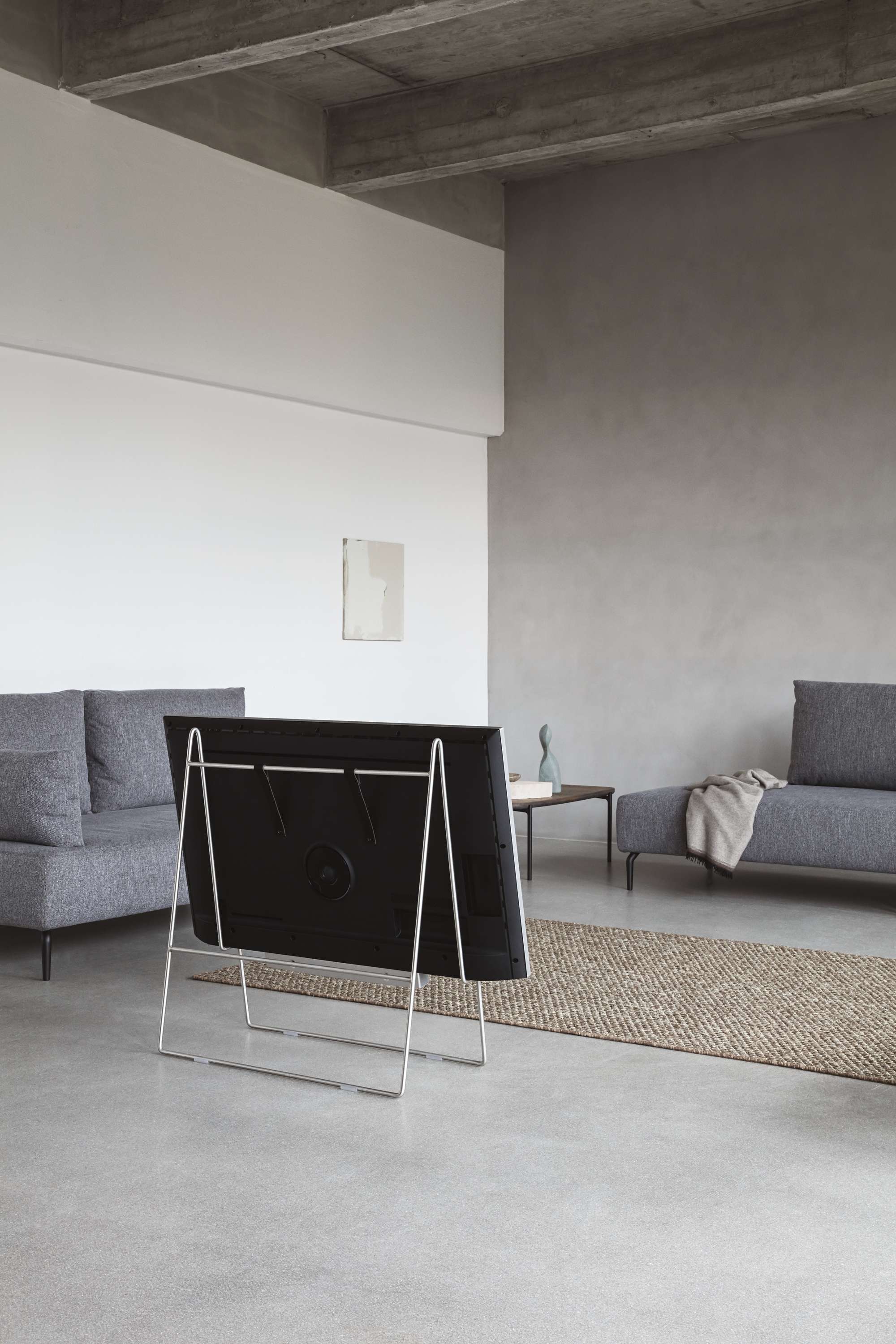 The CARRY TV stand is an understated and versatile TV stand. Unlike fixed or wall-mounted solutions, CARRY allows you to rethink and reconfigure your space effortlessly—rotate the screen to reduce glare, move the stand to free up floor space, or use it as a stylish room divider. Crafted from powder-coated stainless steel and available in a range of colors, CARRY seamlessly complements any décor. It supports TVs from 40 to 65 inches, with leather straps at the back ensuring a secure hold. The gentle backward tilt optimizes the viewing angle, whether you're lounging on the sofa or cooking with your favorite show on in the background. For a clutter-free look, add the CARRY TV Pocket, a discreet storage solution that hides cables and media boxes, creating a tidy, minimalist setup.